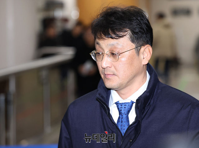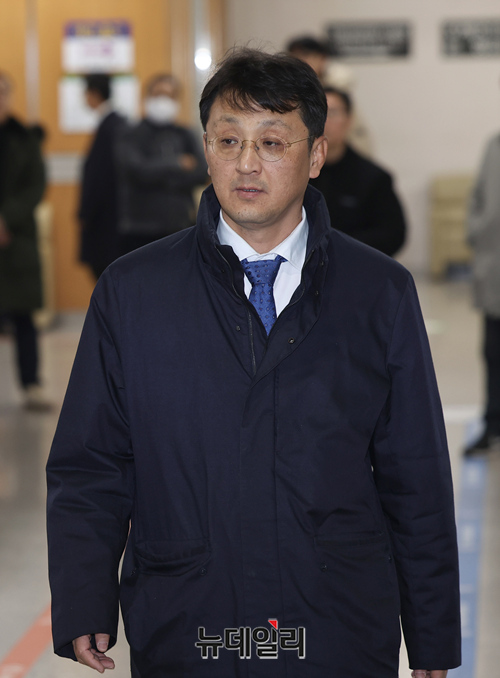 이진석 전 청와대 사회정책비서관이 29일 오후 서울 서초구 중앙지법에서 열린 '울산시장 선거개입·하명수사' 1심 선고 공판에 입장하고 있다. 2020년 1월 재판이 시작된지 약 3년 10개월 만의 선고다.