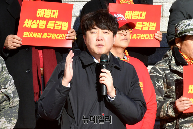 이준석 국민의힘 전 대표가 30일 국회 본관 계단에서 열린 '해병대 채상병 특검법 연내 처리 촉구' 기자회견에서 모두발언을 하고 있다.