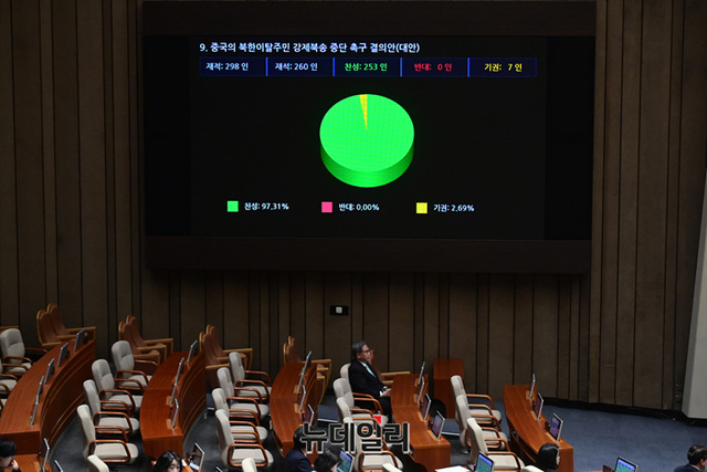 '중국 북한이탈주민 강제북송 중단 촉구 결의안'이 30일 국회에서 본회의를 통과되고 있다.