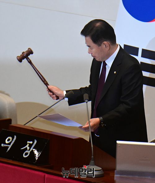 김진표 국회의장이 1일 오후 국회에서 열린 본회의에서 손준성 대구고검 차장검사·이정섭 대전고검 검사 직무대리에 대한 탄핵소추안을 통과 시키고 있다.