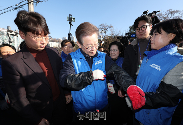 이재명 더불어민주당 대표가 4일 오전 서울 성북구 정릉동 일원에서 연탄 나눔봉사활동을 위해 조끼를 착용하고 있다.