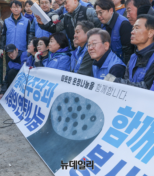 이재명 더불어민주당 대표가 4일 오전 서울 성북구 정릉동 일원에서 연탄 나눔 봉사활동 마치고 당원들과 기념촬영을 하고 있다.