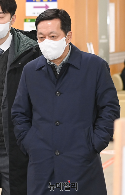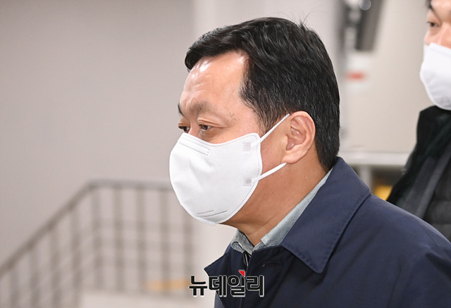 정진상 전 더불어민주당 당대표실 정무조정실장이 5일 오전 서울 서초구 중앙지방법원에서 열린 뇌물수수 혐의 관련 공판에 출석하고 있다.