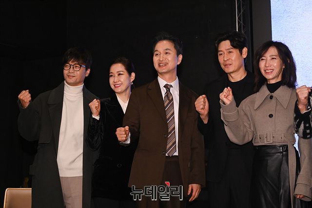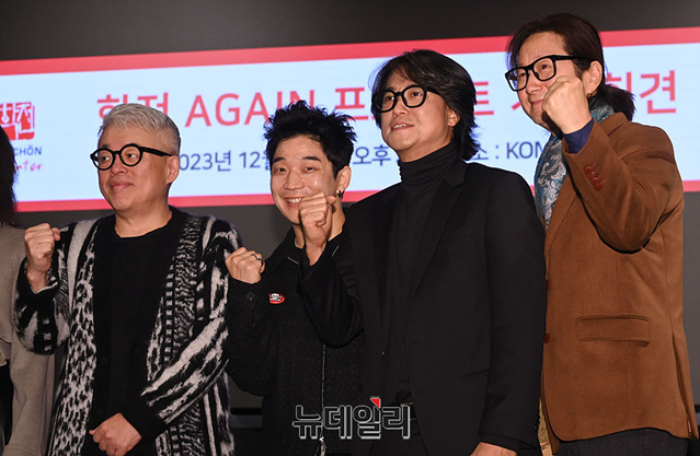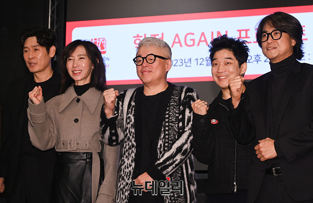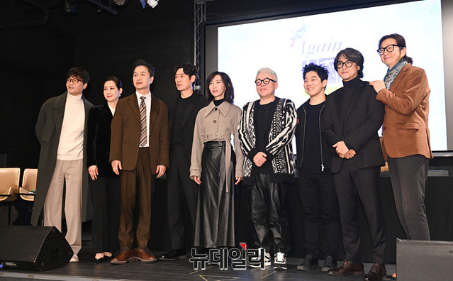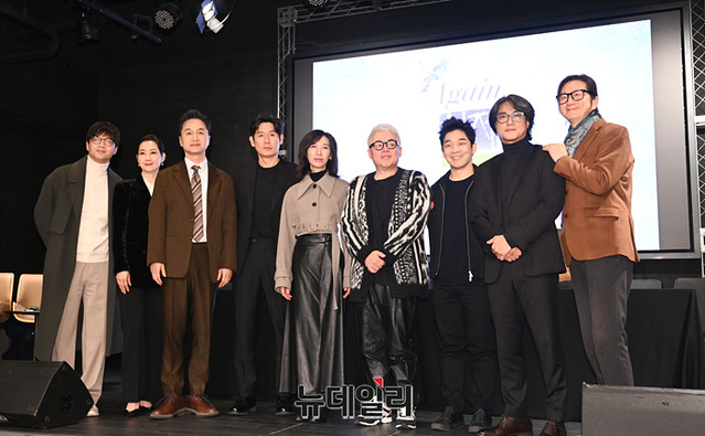 가수 박학기(왼쪽부터), 배우 배해선, 장현성, 설경구, 방은진, 작곡가 김형석, 가수 한경록, 박승화, 루카가 5일 오후 서울 강서구 한국음악저작권협회에서 열린 '학전 어게인 프로젝트 기자회견'에서 포즈를 취하고 있다.학전 출신 문화예술인들과 함께하는 '학전 어게인 프로젝트'는 한국 공연문화의 발원지 학전과 김민기 선생에 대한 인사를 전하기 위한 프로젝트다.창립 33주년을 맞는 2024년 2월 28일부터 3월 14일까지 학전 극장에서 공연된다.