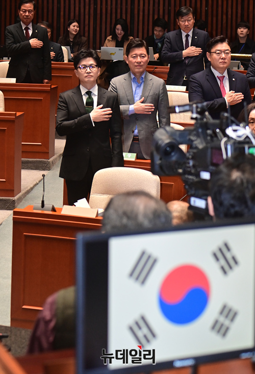한동훈 법무부 장관이 6일 국회에서 열린 국민의힘 정책의원총회에 참석해 국민의례를 하고 있다.