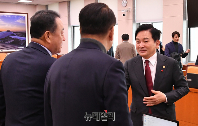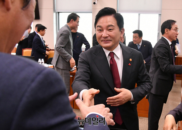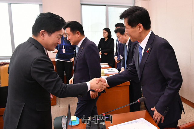 원희룡 국토교통부 장관이 7일 오전 국회에서 열린 국토교통위원회 전체회의에 원들과 악수를 나누고 있다.
