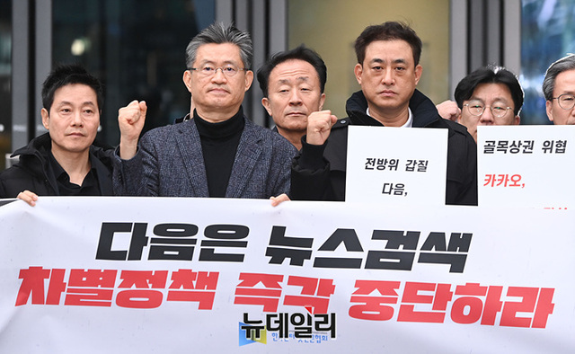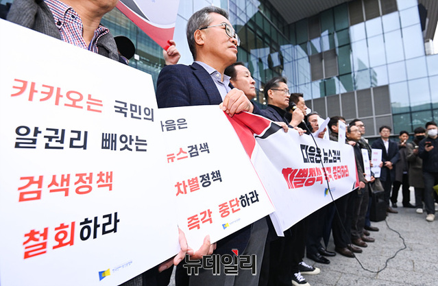한국인터넷신문협회 회장단과 비상대책위원이 11일 오전 경기 성남시 카카오판교아지트에 항의방문해 뉴스검색 차별·중소언론 언로 차단을 규탄하고 있다.포털사이트 다음(Daum)이 11월 22일부터 뉴스 검색 결과 '기본값'을 콘텐츠제휴사(CP)로 변경했다.기존 뉴스 검색 시 전체 언론사(약 1200여개)의 기사가 노출됐지만 앞으로는 다음에 제휴된 CP사(약 100개)들의 기사만 보이게 된다.인터넷신문협회와 비상대책위원들은 1,000여개 검색제휴 언론사를 차별한것에 대해 6일 공문을 보내 카카오 김범수 경영쇄신위원장과 면담을 요청했으나 공식 회신이 오지 않아 항의방문이 이루어졌다.이날 항의방문에서 '전방위 갑질 카카오, 국민 뉴스선택권 막지마라' '지역언론 언로차단 뉴스검색 정책 즉시 철회하라' 등의 문구가 적힌 피켓 시위를 진행했다.