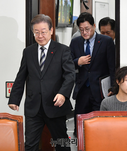 이재명 더불어민주당 대표가 11일 국회에서 열린 최고위원회의에 참석하기 위해 입장하고 있다.