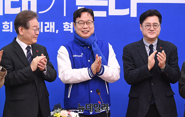 이재명 더불어민주당 대표와 홍익표 원내대표가 14일 오전 국회에서 열린 2차 인재영입식에서 엔씨소프트 임원등을 지낸 이재성씨와 기념촬영을 하고 있다.