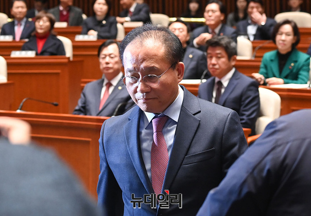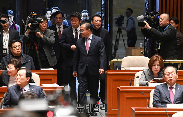 윤재옥 국민의힘 당대표 권한대행이 15일 오전 국회에서 열린 비상의원총회에 참석하고 있다.