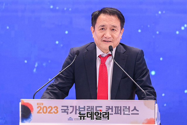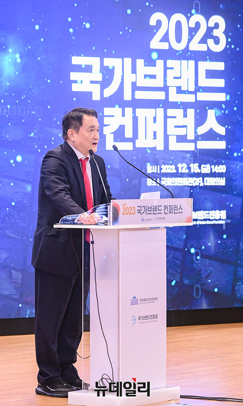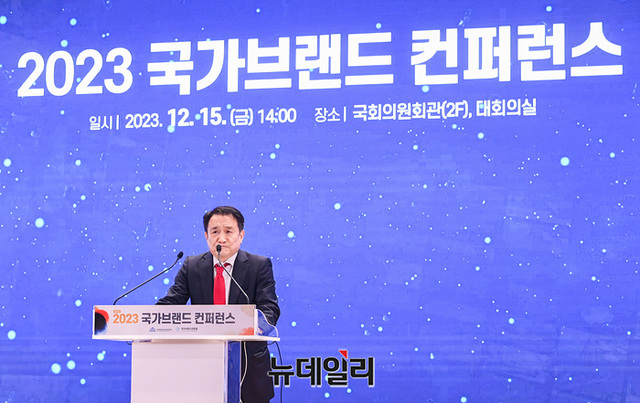 최유진 국가브랜드진흥원 원장이 15일 오후 국회 의원회관에서 열린 '2023 국가브랜드 컨퍼런스'에서 환영사를 하고 있다.