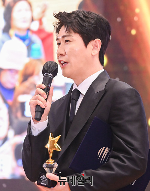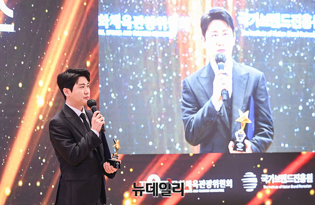 대중문화부문 대상을 수상한 가수 영탁이 15일 오후 국회 의원회관에서 열린 '2023 국가브랜드 컨퍼런스'에서 수상소감을 밝히고 있다.