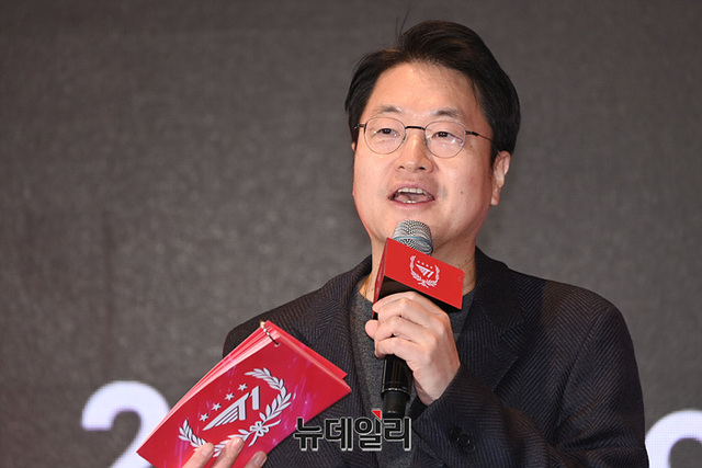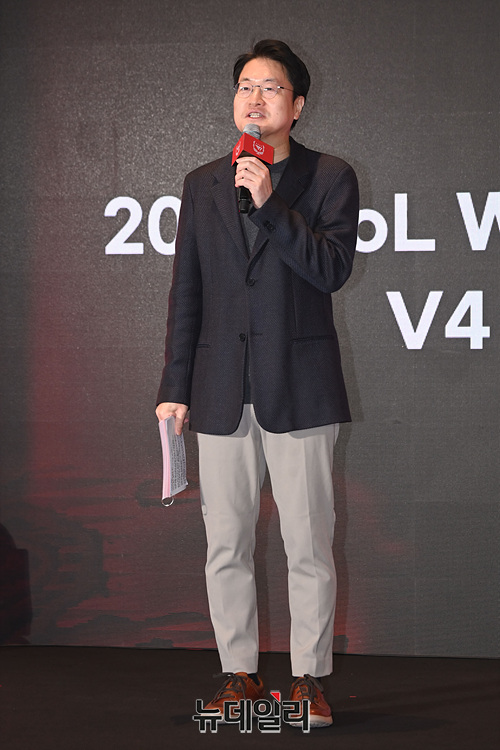 LCK 리그 중계를 맡고 있는 전용준 캐스터가 18일 오전 서울 중구 SKT 본사에서 열린 'T1 롤드컵 우승 축하 행사'에서 선수들을 소개하고 있다.