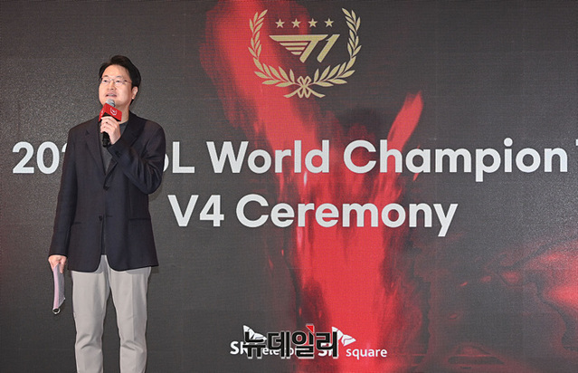 이날 행사는 T1의 통산 4회, 7년만의 우승을 축하하기 위해 개최됐다. 김정균 감독과 T1 '페이커 이상혁' '구마유시 이민형' '오너 문현준' '제우스 최우제' 선수 등이 참석했다.