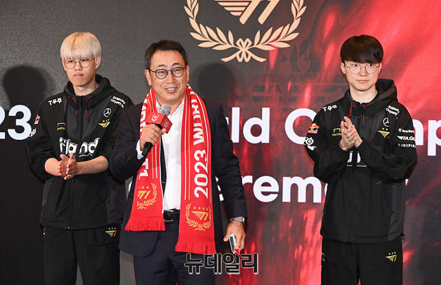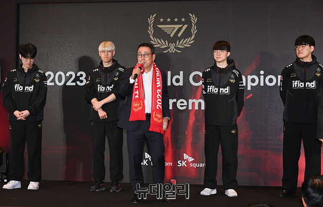 이날 행사는 T1의 통산 4회, 7년만의 우승을 축하하기 위해 개최됐다. 김정균 감독과 T1 '페이커 이상혁' '구마유시 이민형' '오너 문현준' '제우스 최우제' 선수 등이 참석했다.