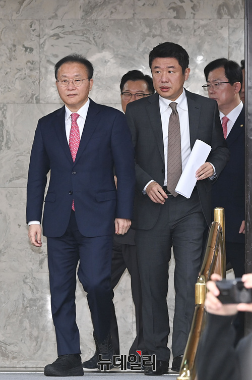 윤재옥 국민의힘 당대표 권한대행과 유의동 정책위의장이 19일 오전 국회에서 열린 국민의힘 원내대책회의에 참석하고 있다.