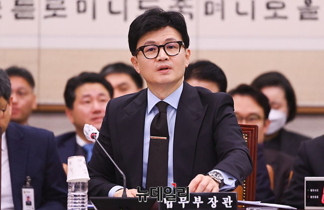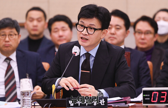 한동훈 법무부 장관이 19일 오후 국회에서 열린 법제사법위원회 전체회의에서 의원들의 질의에 답변하고 있다.