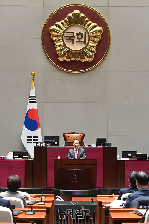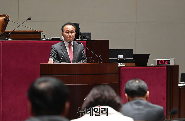 윤재옥 국민의힘 당대표 권한대행이 20일 오후 국회에서 열린 국민의힘 의원총회에서 모두발언을 하고 있다.