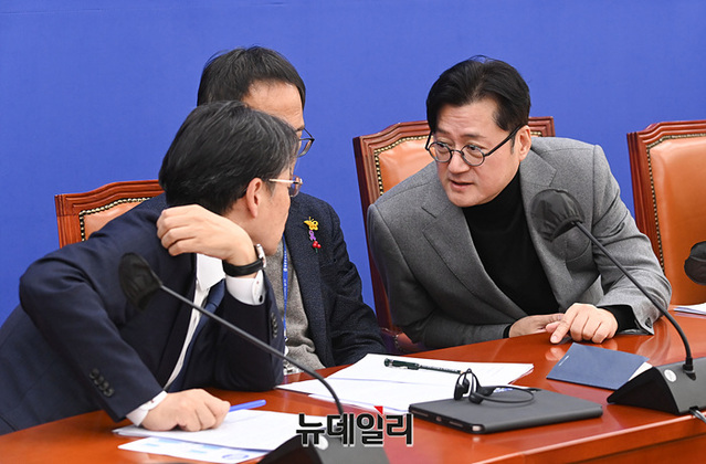 홍익표 더불어민주당 원내대표가 21일 오전 국회에서 열린 정책조정회의에서 대화를 나누고 있다.