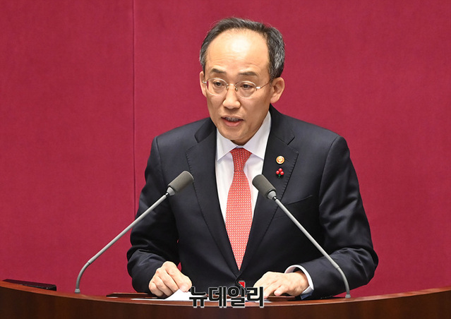 추경호 경제부총리 겸 기획재정부 장관이 21일 오후 국회에서 열린 본회의에서 2024년 예산안 제안 설명을 하고 있다.