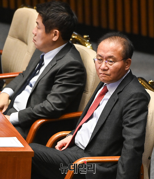 윤재옥 국민의힘 당대표 권한대행이 21일 오후 국회에서 열린 본회의에 참석한 김기현 전 대표를 응시하고 있다.