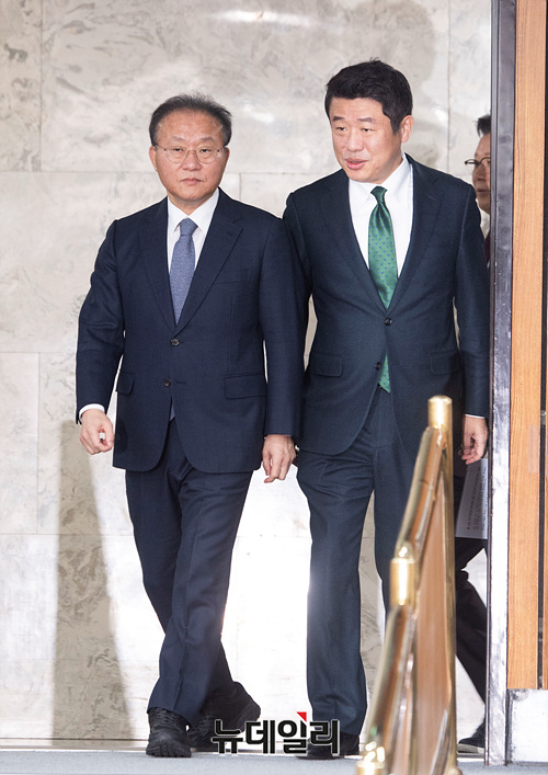 윤재옥 국민의힘 당대표 권한대행과 유의동 정책위의장이 26일 오전 국회에서 열린 국민의힘 원내대책회의에 참석하고 있다.