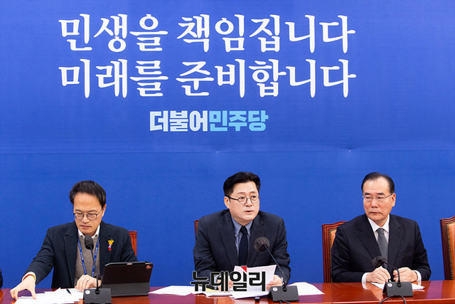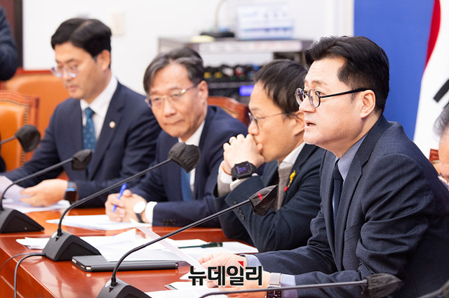 홍익표 더불어민주당 원내대표가 26일 오전 국회에서 열린 원내대책회의에서 모두발언을 하고 있다.