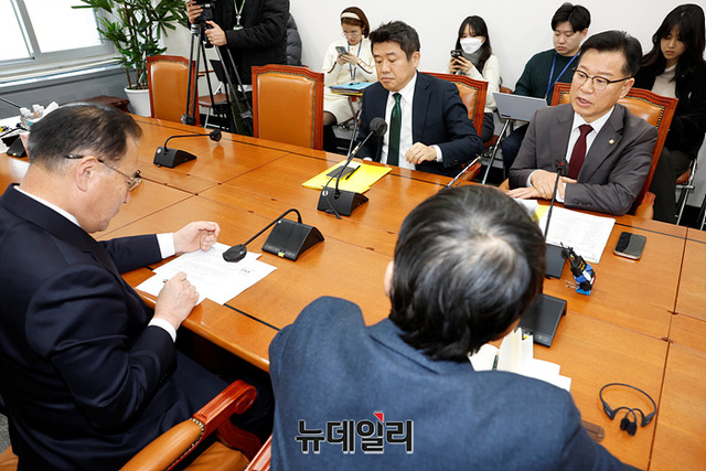 유의동 국민의힘 정책위의장과 이양수 원내수석부대표, 이개호 더불어민주당 정책위의장과 박주민 원내수석부대표가 26일 오후 서울 여의도 국회에서 열린 여야 2+2 합의체 회의에서 의견을 나누고 있다. (사진=공동취재단)