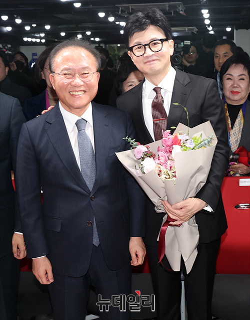 한동훈 국민의힘 비상대책위원장과 윤재옥 당대표 권한대행, 유의동 정책위의장이 26일 오후 서울 여의도 국민의힘 중앙당사에서 기념촬영을 하고 있다. (사진=공동취재단)