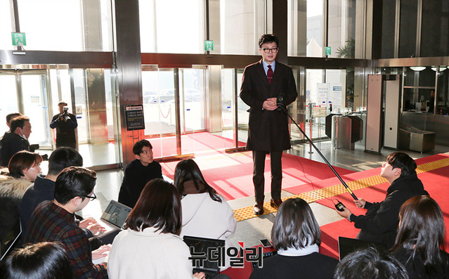 한동훈 국민의힘 비상대책위원장이 27일 오전 국회에 마련된 비상대책위원장실로 출근하며 취재진의 질문에 답하고 있다.