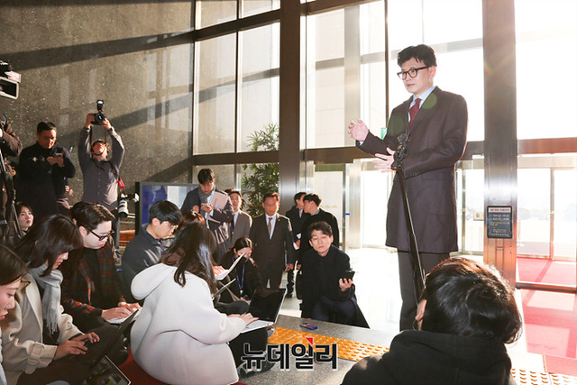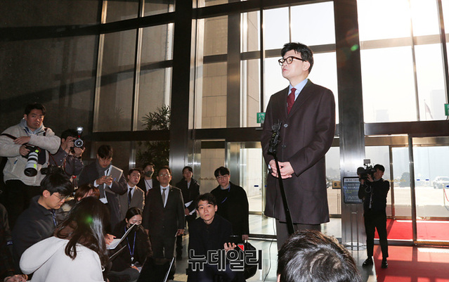 [포토] 국회 출근길, 질의응답하는 한동훈 비대위원장