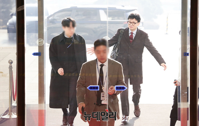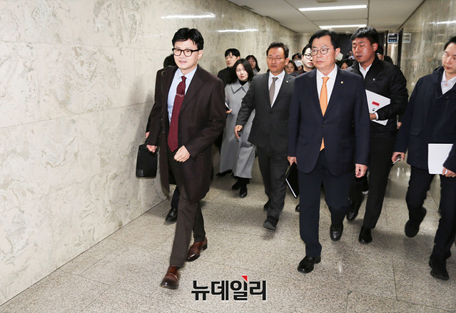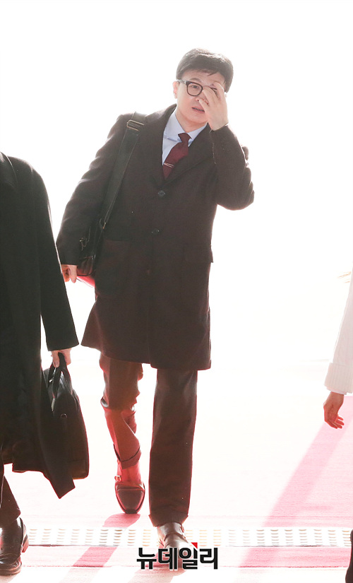 한동훈 국민의힘 비상대책위원장이 27일 오전 국회에 마련된 비상대책위원장실로 출근하고 있다.