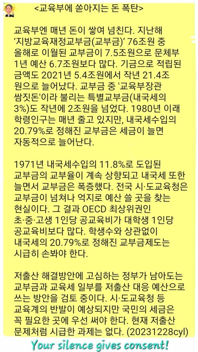 학생수와 상관없이 내국세의 20.79%로 정해진 교부금제도는 시급히 손봐야 한다.저출산 해결방안에 고심하는 정부가 남아도는 교부금과 교육세 일부를 저출산 대응 예산으로 쓰는 방안을 검토 중이다.
