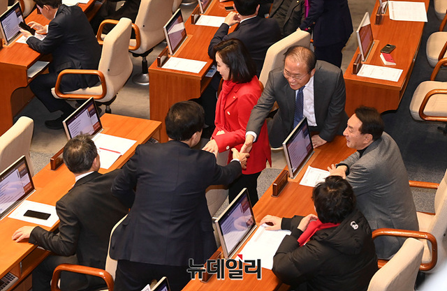 김기현 전 국민의힘 대표와 윤재옥 국민의힘 당대표 권한대행 겸 원내대표가 28일 오후 국회에서 열린 본회의에서 인사를 나누고 있다.