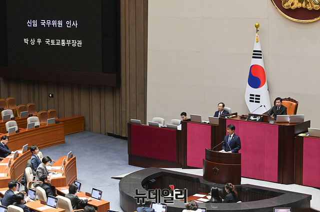 박상우 신임 국토교통부 장관이 28일 오후 국회에서 열린 본회의에서 인사말을 하고 있다.