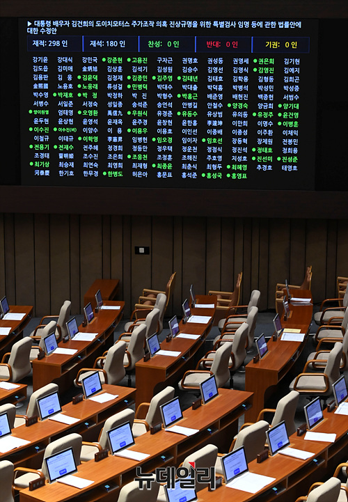화천대유 '50억 클럽' 뇌물 의혹 사건의 진상규명을 위한 특별검사의 임명 등에 관한 법률안과 대통령 배우자 김건희의 도이치모터스 주가조작 의혹 진상규명을 위한 특별검사 임명 등에 관한 법률안이 자동 상정된 28일 오후 국회 본회의에서 국민의힘 의원들이 퇴장한 가운데 표결이 진행되고 있다.