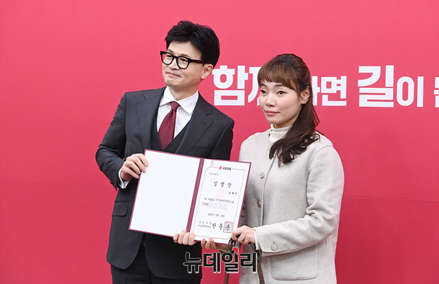 한동훈 국민의힘 비상대책위원장이 29일 오후 국회에서 열린 비상대책위원 임명장 수여식에서 김예지 국민의힘 의원에게 임명장을 수여하고 있다.