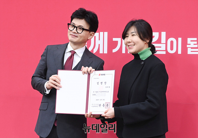 한동훈 국민의힘 비상대책위원장이 29일 오후 국회에서 열린 비상대책위원 임명장 수여식에서 장서정 돌봄·교육 스타트업 대표에게 임명장을 수여하고 있다.