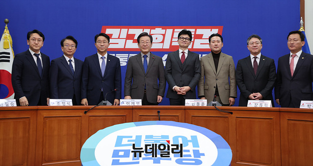 한동훈 국민의힘 비상대책위원장과 이재명 더불어민주당 대표가 29일 오후 더불어민주당 당대표실에서 기념촬영을 하고 있다. (사진=공동취재단)