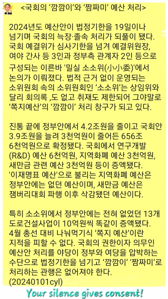 <국회의 ’깜깜이’ 와 ‘짬짜미’ 예산 처리>2024년도 예산안이 법정기한을 19일이나 넘기며 국회의 늑장·졸속 처리가 되풀이 됐다.