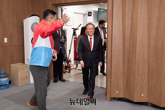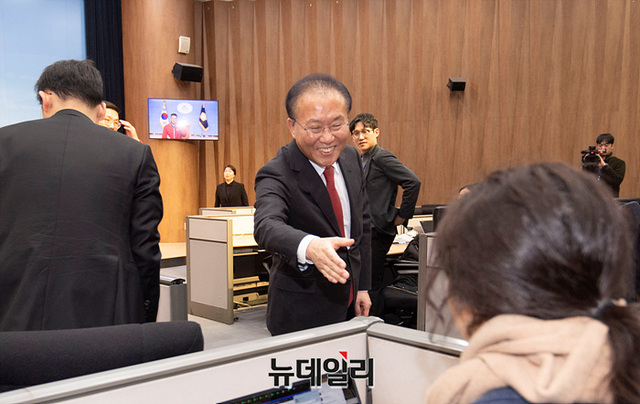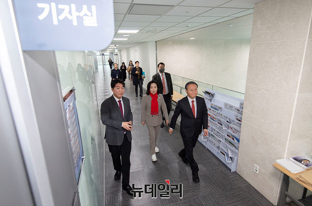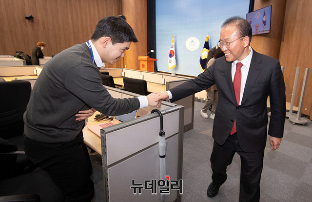윤재옥 국민의힘 원내대표가 2일 오전 국회 소통관을 찾아 기자들과 인사를 나누고 있다.