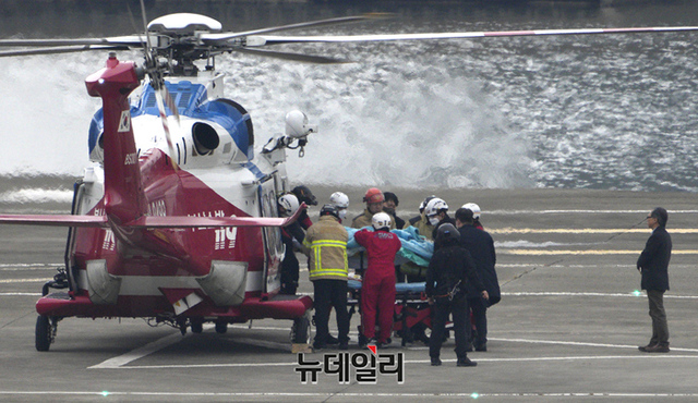 부산 방문 중 괴한에게 피습 당한 이재명 더불어민주당 대표가 2일 오후 서울 노들섬 헬기착륙장에 도착해 응급차로 긴급 수송되고 있다. 이 대표는 서울대학교병원으로 이송돼 수술을 받을 것으로 알려졌다.