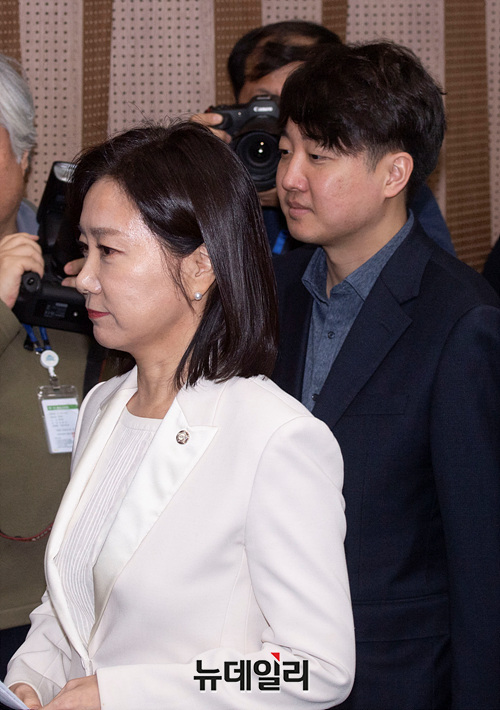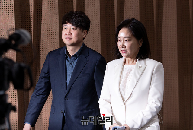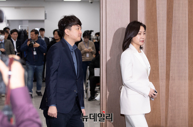 이준석 전 국민의힘 대표와 허은아 의원이 3일 오전 국회에서 열린 국민의힘 탈당 기자회견에 참석하고 있다.
