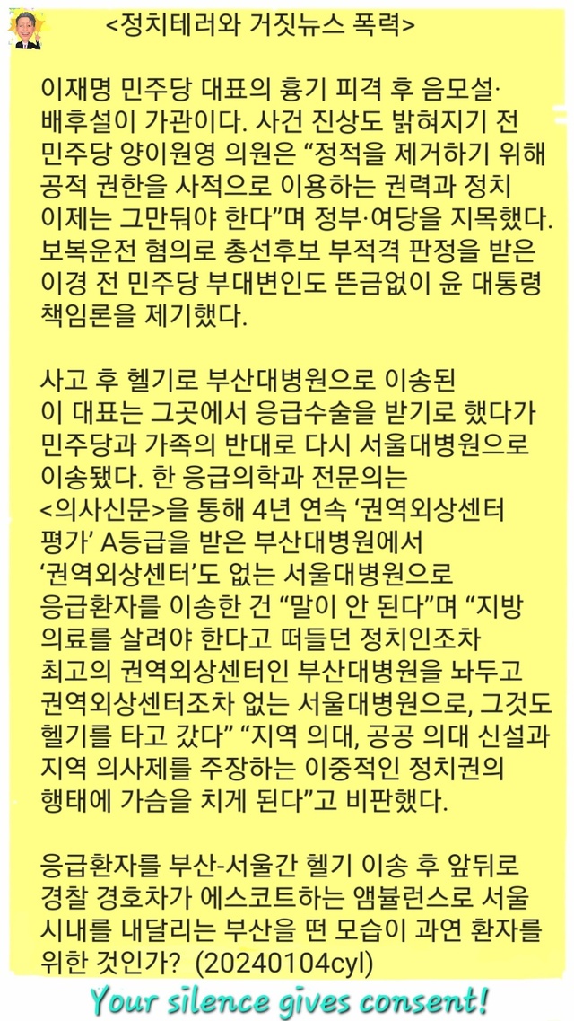 <정치테러와 거짓뉴스 폭력>이재명 민주당 대표의 흉기 피격 후 음모설·배후설이 가관이다.