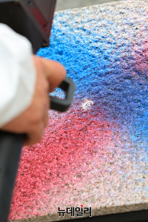 이태종 국립문화재연구원 학예연구사가 4일 오전 서울 종로구 경복궁 영추문에서 레이저 장비를 활용해 낙서 제거 작업을 시연하고 있다.
