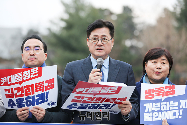 '쌍특검법(김건희 도이치모터스 주가조작 의혹·대장동 50억 클럽)'이 국회에서 정부로 송부된 4일 오후 서울 용산구 대통령실 앞에서 홍익표 더불어민주당 원내대표와 당 지도부가 긴급기자회견을 열고 특검을 수용할것을 촉구하고 있다.