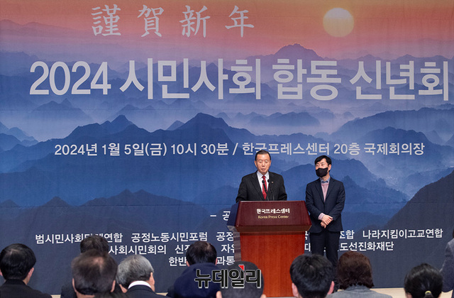 홍문표 국민의힘 의원이 5일 오전 서울 중구 한국프레스센터에서 열린 2024 시민사회 합동 신년회에서 축사를 하고 있다.
