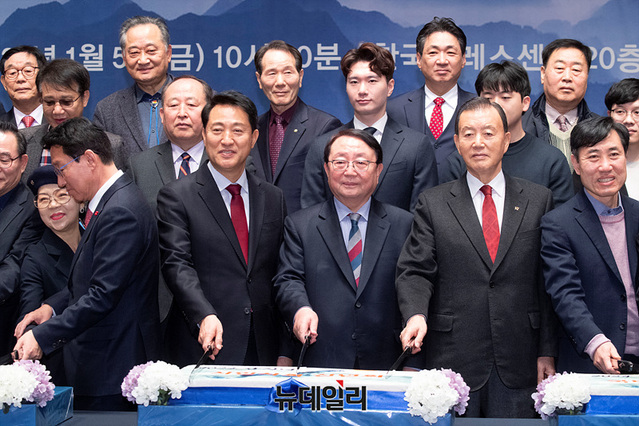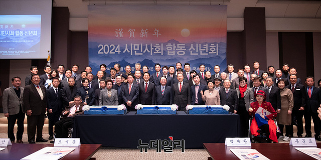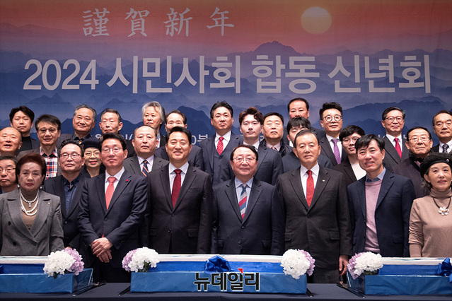오세훈 서울시장, 이갑산 범시민사회단체연합 회장을 비롯한 참석자들이 5일 오전 서울 중구 한국프레스센터에서 열린 2024 시민사회 합동 신년회에서 떡커팅과 기념촬영을 하고 있다.