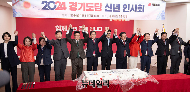 한동훈 국민의힘 비상대책위원장과 유의동 정책위의장, 안철수 의원, 김예지 의원 등 당직자들이 5일 오후 국민의힘 경기도당에서 열린 신년인사회에서 손을 맞잡아 들고 있다. (경기 수원=서성진 기자)