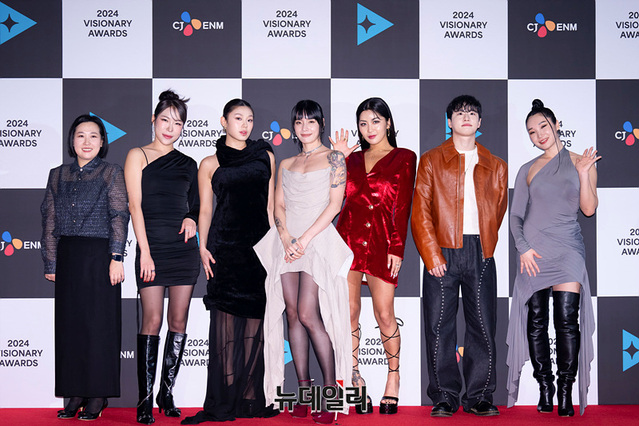 댄서 모니카와 효진초이, 리정, 리헤이, 필독, 립제이가 7일 오후 서울 마포구 CJ ENM 센터에서 열린 '2024 비저너리 어워즈' 레드카펫에서 포즈를 취하고 있다.
